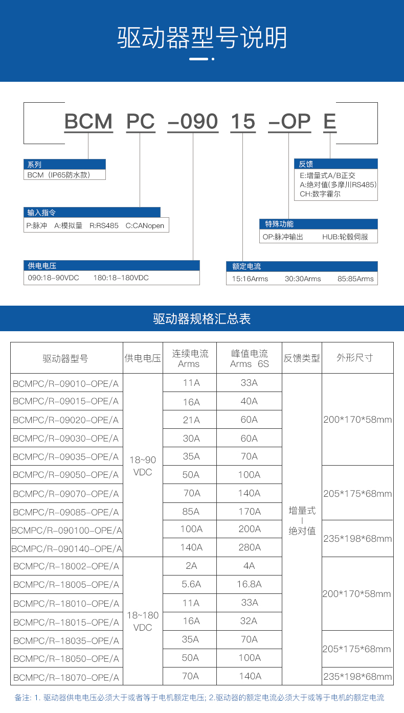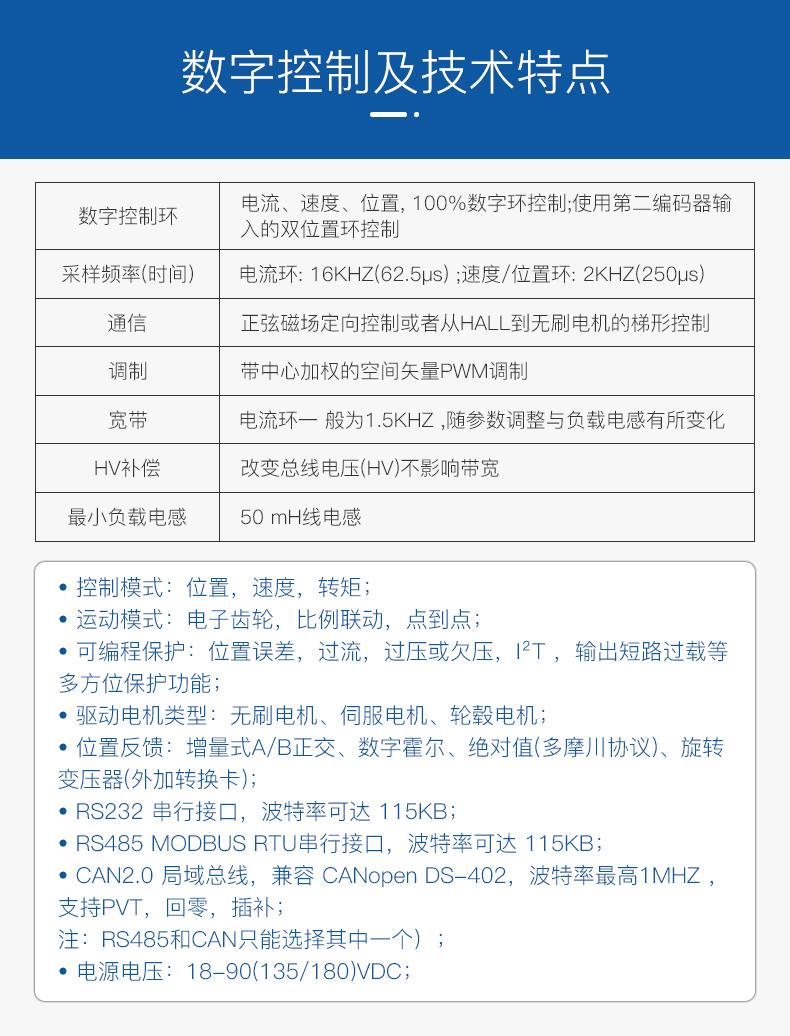 驅(qū)動(dòng)電機(jī)與反饋?:可驅(qū)動(dòng)永磁無刷電機(jī)、伺服電機(jī)、輪轂電機(jī)等電機(jī)類型,支持增量式編碼器、數(shù)字霍爾;絕對(duì)值編碼器、旋轉(zhuǎn)變壓器等反饋類型。